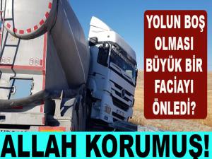 Erzurum'un Aşkale ilçesinde meydana gelen trafik kazasında sürücüsünün direksiyon hakimiyetini kaybettiği tır, yolun ortasında karşı şeride geçerek durabildi.