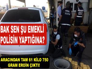 Narkotik köpeği 'Dük' ile otomobilde yapılan aramada, aracın çamurluğuna yapılmış özel bölümde gizlenen 61 kilo 750 gram eroin ele geçirildi.Emekli polis S.N.A. gözaltına alındı.