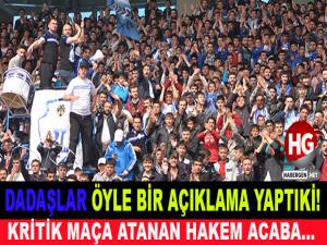 Dadaşlar grubu sosyal medya hesabından yapılan açıklamada "Bizler Erzurumspor camiası olarak son zamanlarda MHK'nın yapmış olduğu hakem atamalarını şaşkınlıkla takip etmekteyiz. Son olarak BB Erzurumspor - Başakşehir maçının orta hakemi olarak atanan Fırat AYDINUS'un 20 gün sonra hakemlik kariyerini sonlandıracağı bilinmekteyken, düşme hattını şekillendirecek ve çok ilgilendiren böylesine önemli bir müsabakaya atanması bizleri yine şaşırtmıştır.