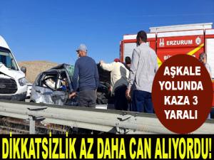 Erzurum'un Aşkale ilçesinde meydana gelen trafik kazasında 3 kişi yaralandı.Alınan bilgilere göre, kaza sabah 08.30 sıralarında eski Küçük Geçit Köyü mevkisin de meydana geldi. Yapımı devam eden yolda seyir halinde olan 09 RA 555 plakalı otomobilin sürücüsü H.F. tek şeritten çıkarken direksiyon hakimiyetini kaybederek karşıdan gelen A.B idaresindeki 25 EM 301 plakalı minibüsle çarpıştı. Kazada sürücü H.F. ve yanında bulunan iki çocuğu yaralandı.Olay yerine gelen ambulansla yaralılar Aşkale İlçe Devlet Hastanesine kaldırılarak tedavi altına alındı.Kaza nedeniyle yaklaşık yarım saat kapalı kalan yol araçların kenara alınması sonrası İlçe Jandarma ekipleri tarafından kontrollü olarak tekrardan trafik akışı sağlandı.