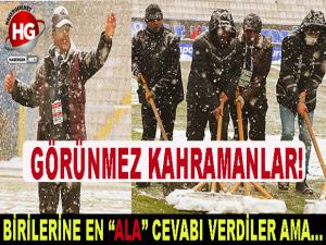 Türkiye'nin diğer illerinde 10 santim kar yağdığı zaman kıyameti koparanlar bir tarafa Erzurum'da hafta sonu yağan kar ve oynanmaz gözü ile bakılan Erzurumspor Samsunspor maçına stadyum personeli damga vurdu.