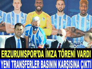 BB Erzurumsporda toplu imza töreniyle yeni transferlerini kamuoyunda tanıttı. Süper Ligin yeni ekibi Büyükşehir Belediye Erzurumsporda 9 yeni transfer için Antrenman Sahasında toplu imza töreni düzenlendi. Kulüp Başkanı Hüseyin Üneş, yeni transferlerin takıma çok ciddi katkı sağlayacaklarını söyledi. Onursal Başkan Mehmet Sekmenin de katıldığı törende futbolcular Mavi-beyaz forma giyerek kendilerini Erzurumsporlu yapan resmi sözleşmeleri imzaladı.