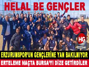 U-19 gelişim liginde rakiplerine aman vermeyen Erzurumspor genç takımı Erteleme maçında Bursaspor'u 3 - 2 mağlup ederek ederek liderliğini perçinledi.