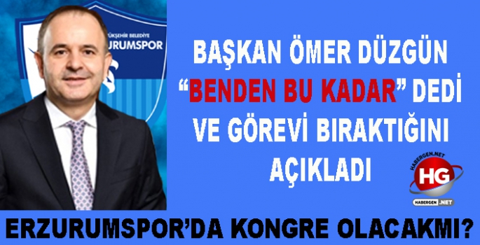 Spor Toto 1.Lig ekiplerinden BB Erzurumspor Başkanı Ömer Düzgün, Onursal Başkan Mehmet Sekmen ile yaptıkları istişare sonucu görevi bırakma kararı aldığını Klüp tesislerinde basın toplantısı düzenleyen Başkan Ömer Düzgün, konuşmasına sezon değerlendirmesi yaparak başladı. Gelinen noktada kendilerinin başarılı bir yönetim sergilediğini ifade eden Başkan Düzgün, "iyi günlerimiz ve kötü günlerimiz oldu. Özellikle kulübün maddi sorunlarını giderme noktasında çok yoğun çalışmalar sergiledik. Sahada her ne kadar istediğimiz sonuçları alamasakta malesef play-off'da masa başı oyunlar ile elendik. Sonuç olarak Süper lige çıkamadığımız için çok üzgünüz. Kulübümüzün onursal Başkanı ve Büyükşehir Belediye Başkanımız Mehmet Sekmen ile yaptığımız son toplantıda kendisine görevi bıraktığımı ilettim. Çünkü çok yorulduk ve yıprandık. hak etmediğimiz eleştiriler ve hakaretler gördük. Kulübün şuan için 97 Milyon lira borcu bulunmaktadır. Ayrıca mevcut kadrodan 12 futbolcumuz ile sözleşmelerimiz devam ediyor" dedi. Düzgün, Kongre sürecinde ise Teknik Direktör Muzaffer Bilazer ile yeni yönetim belli olana kadar süreci yönetmeye devam edeceklerini vurguladı. Bu arada Ömer düzgün'un igörevi bırakmasının kendi isteği üzerine olduğunu belirtmesine rağmen Onursal Başkan Mehmet Sekmen'in bu talebe sıcak bakmadığıda gelen bilgiler arasında olurken, Kongre sürecinin başlayıp başlamayacağına Büyükşehir belediye Başkanı Mehmet Sekmen'in karar vereceği ifade edildi.