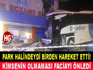 Park halindeki yolcu otobüsünün freni boşalınca 600 metre sonra binaya çarparak durabildi