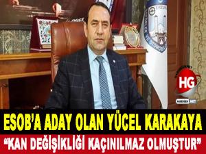Uzun yıllardır Şoförler ve Otomobilciler Esnaf Odası Başkanlığı'nı yapan Yücel Karakaya, yaptığı yazılı açıklamada, "Erzurum esnafının çözüm bekleyen sorunları var. Esnafının sesi, soluğu olmaktan uzaklaşan ESOB'da ise 'kan değişikliği' kaçınılmaz olmuştur. Bu nedenle önümüzdeki aylarda yapılacak olan Erzurum Esnaf ve Sanatkarlar Odaları Birliği Başkanlığı'na adayım" dedi.